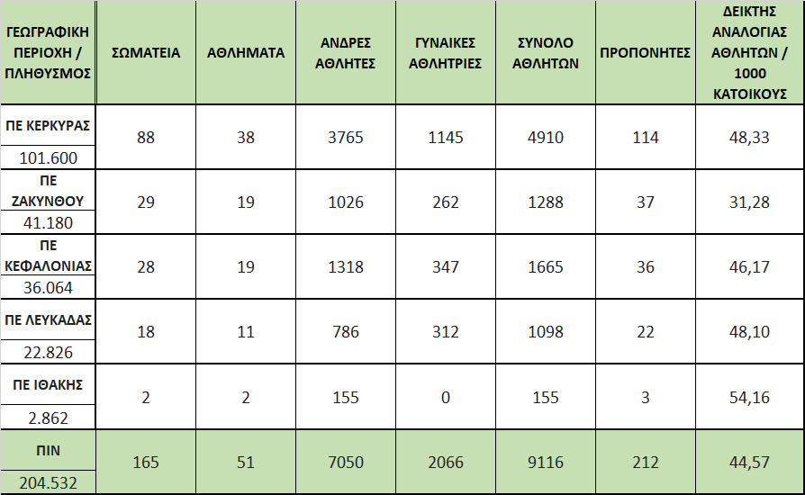 Σύμφωνα με τα στοιχεία του υποσυστήματος η επικράτεια έχει 6451 ενεργά και αναγνωρισμένα αθλητικά σωματεία, 456.264 εγγεγραμμένους αθλητές και 10514 πιστοποιημένους προπονητές. Η Περιφέρεια Ιονίων Νήσων έχει 9113 αθλητές, 212  προπονητές και 165 αθλητικά σωματεία.